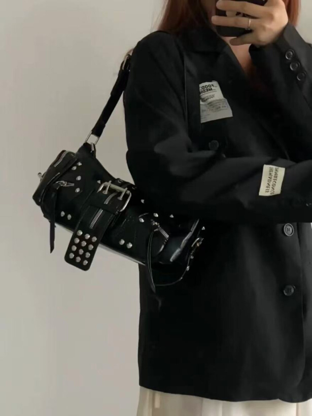 Este bolso mini negro es una pieza contundente y con mucha actitud, diseñada para quienes buscan un accesorio que marque carácter desde el primer vistazo. Su formato alargado tipo baguette, combinado con tachuelas metálicas, hebillas y cremalleras visibles, lo convierte en un bolso protagonista dentro de cualquier look urbano o alternativo.