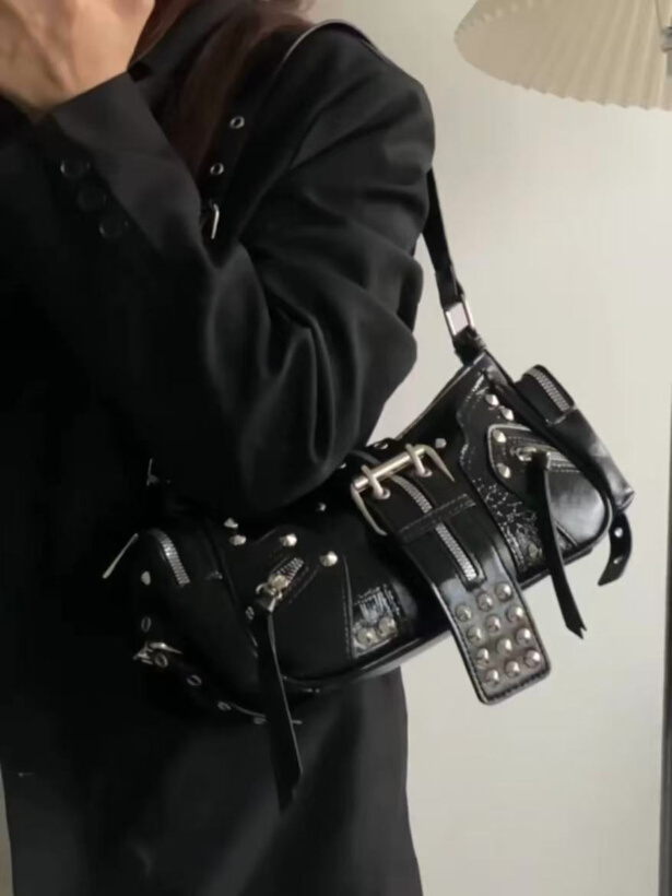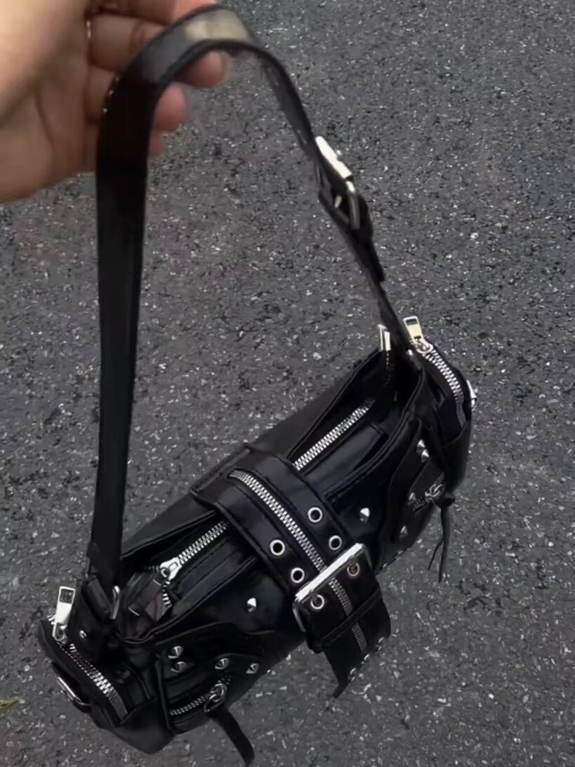 Cuenta con asa corta ajustable, ideal para llevar al hombro o bajo el brazo, aportando un estilo muy actual inspirado en la estética street y punk contemporánea. Los detalles metálicos en tono plateado refuerzan su diseño rebelde y moderno, convirtiéndolo en un accesorio ideal para looks negros, minimalistas o de inspiración underground.